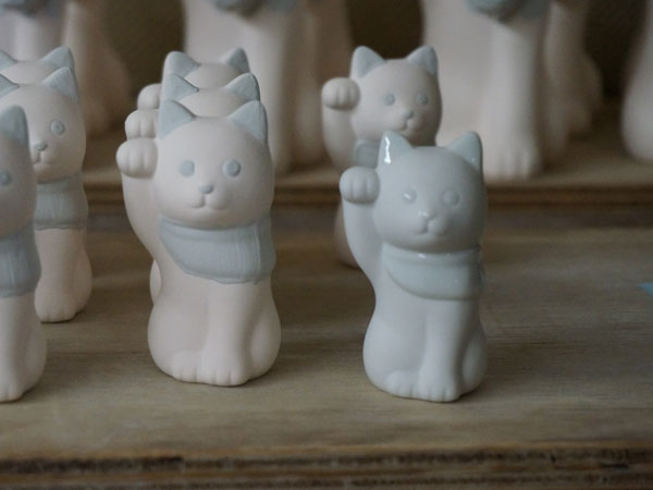 二寸サイズの猫は、主に耳・目・襟元などの部分に釉薬をのせています。釉薬は本来、器ならまとめて浸けることが多いもの。ですが招き猫はかたちが複雑なため、筆を使って塗られていて、器より手間をかけた丁寧な作業が必要とされます。