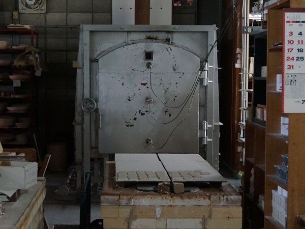 この銀色の窯が電気窯です。絵柄にもよりますが、800度前後で焼くことが多いそう。