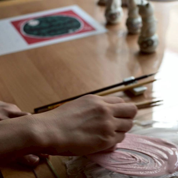 素焼きを終えた後は、絵柄がのる部分にだけ釉薬が施されます。