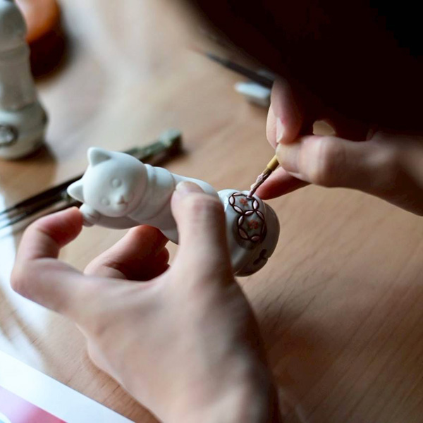 6. 猫と鈴のパーツを接合。釉薬をかけ、絵付けを施す。