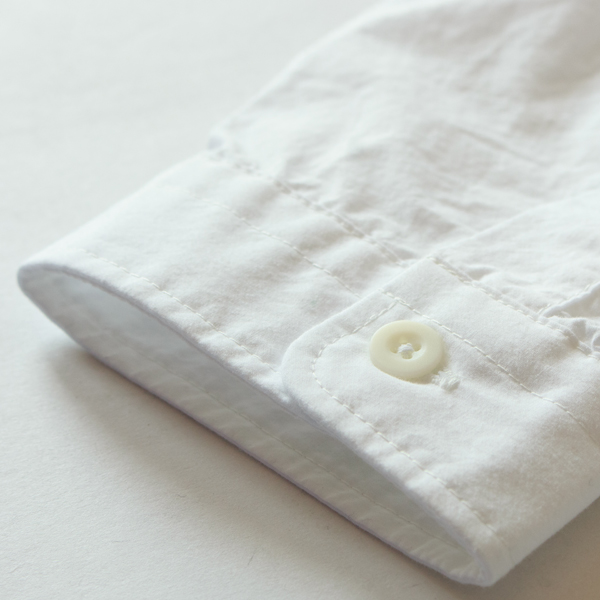 一般的な6cmカフスでは2回折り返しても袖口が分厚くなりがちですが、このシャツは4cmの短いカフスを採用。袖捲りしてもすっきりとこなれた印象に。紫外線対策を兼ねて夏場も快適に着用いただけます。