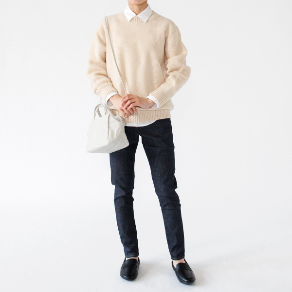 冬はニットを重ねてきちんと感を程よく崩して(スーピマコットンシャツ着用)