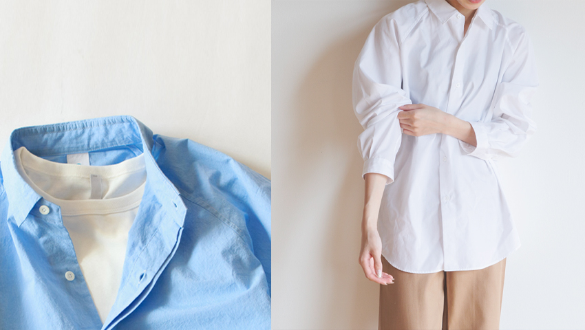 スーピマコットンシャツは、軽い上、きちんと感が出る仕立てでお仕事着にもおすすめです。どちらも洗うほどに気持ちのいい生地へと育っていくものでお作りしています。