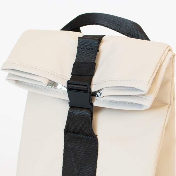 The outer material is made of water-repellent fabric, so you don't have to worry about sudden rain or spilling drinks. Just wipe it off and it will repel water and dirt. The inside is made of silver-coated material, which has a simple cooling and heat retention effect that keeps food at the right temperature. And what's especially convenient is that it can be changed to fit the amount of luggage you have. Just adjust the way the top is rolled up to make it the perfect size for when you have a little or a lot. When not in use, it can be folded up compactly and is easy to carry.