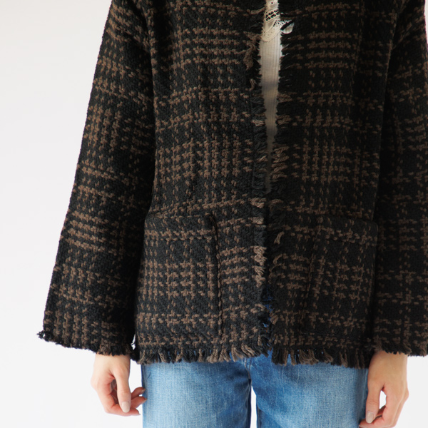 John Branigan, a manufacturer of Irish tweed and other knitwear, has a short, hand-knitted fringe jacket. The fabric is incredibly soft and comfortable, with a comfortable feel that's not restrictive. The fabric, woven rhythmically in a basket-like pattern, is primarily made of wool, providing excellent warmth. While thicker than typical sweaters and cardigans, it can be worn indoors without needing to be removed, making it a great choice for those who are sensitive to the cold.