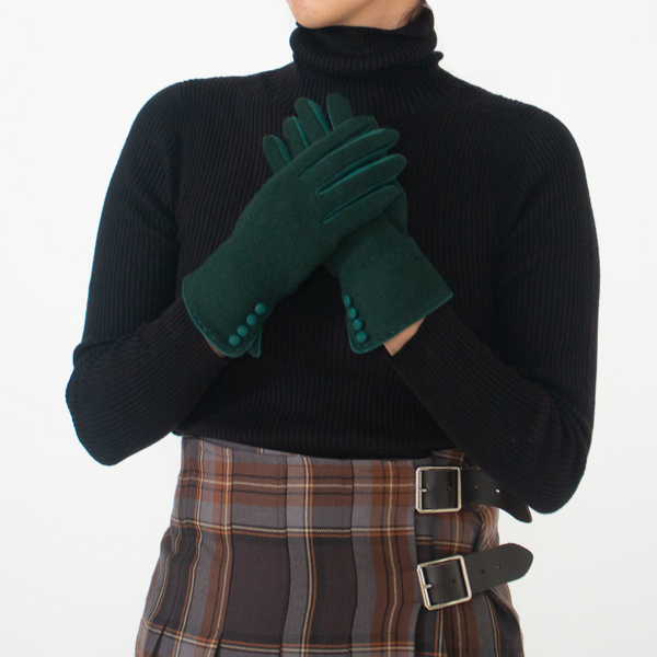 スーツやジャケットスタイルにも似合う、lapero(ラペロ)の手袋。ころんとしたクルミボタンの愛らしさと、指の間に見え隠れするツートンカラーが指を長く見せ、おしゃれのアクセントになっています。